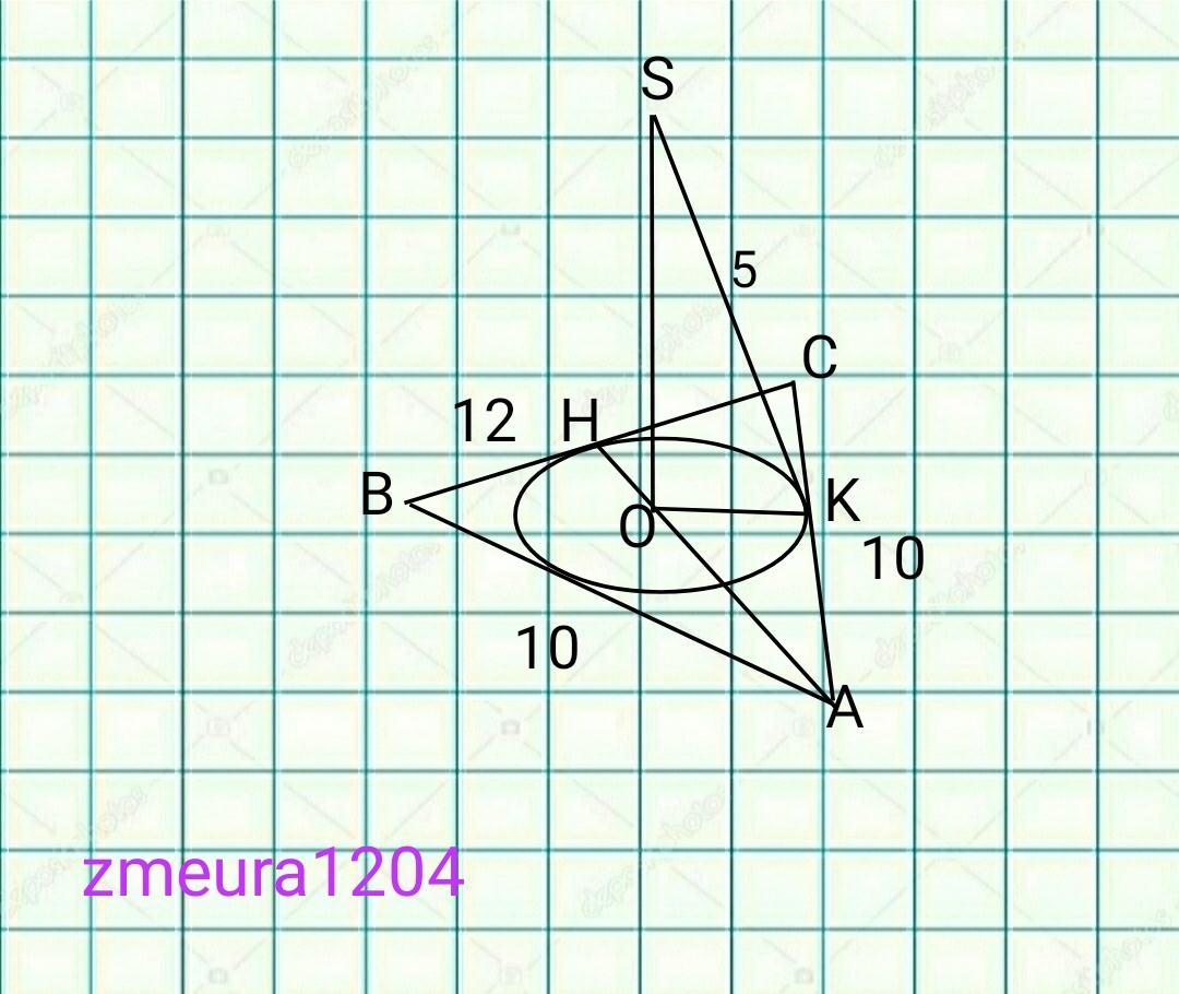 Основание и боковая сторона равнобедренного треугольника равны 12 см и 10 см соответственно. Некоторая точка пространства находится на расстоянии 5 см от каждой стороны треугольника. Найдите расстояние от данной точки до плоскости треугольника. Подробное решение пожалуйста!!!