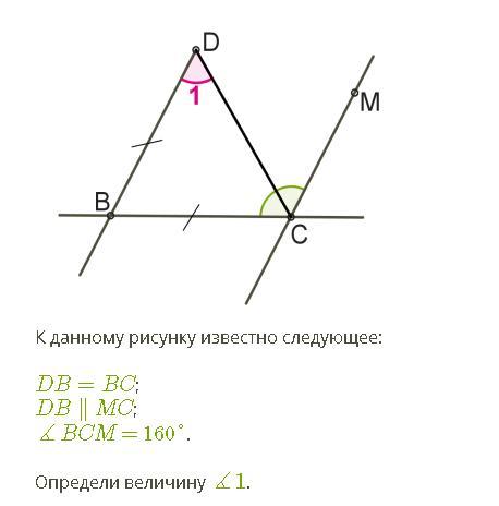 по правилу паралельних прямих и сечной кут bcm равен куту cmo(точка o идёт дальше db) по правилу внутрених кутов. по правилу сумежних кутов 180-160=20 градусов(bca)(точка a идёт дальше mc)? njulf ren сbd тоже 20 градусов, треугольник bcd равнобедрений тогда, кут d и кут c равни. (180-20):2=80 градусов