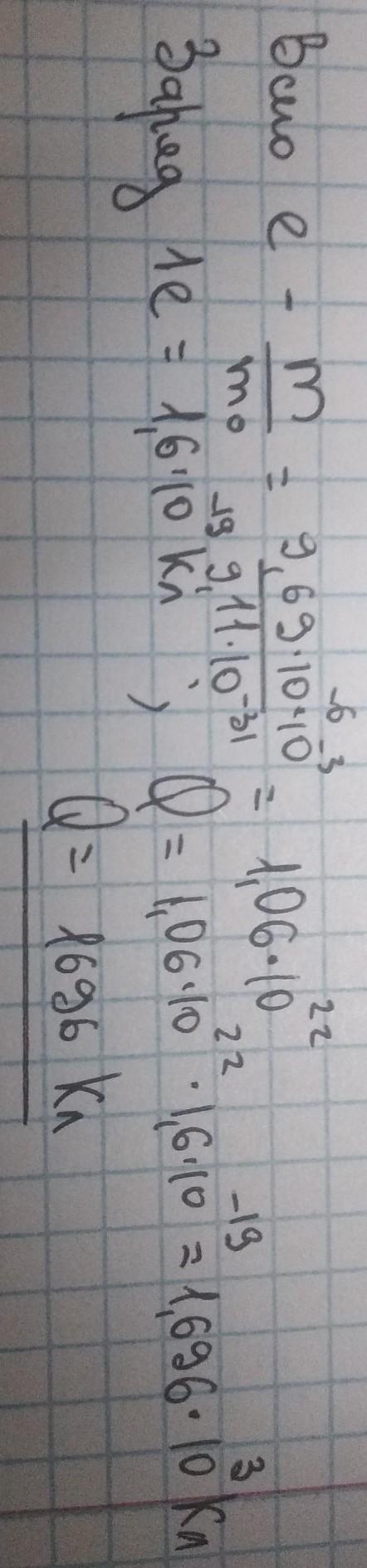Определите суммарный заряд электронов, если их общая масса m = 9,69 × 10^-6г. Масса одного электрона m0 = 9,11 × 10^-31 кг