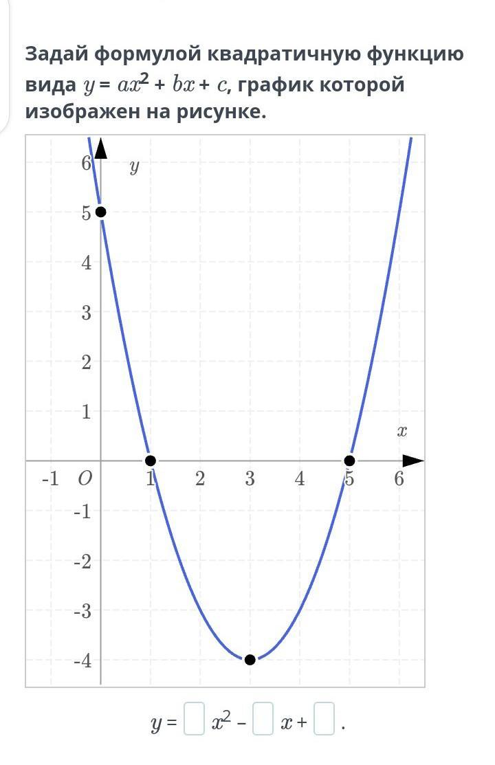 1) Т.к. график параболы пересекает ось Ох в точках х₁=1 и х₂=5, то эти точки являются корнем уравнения ax²+bx+c=0
