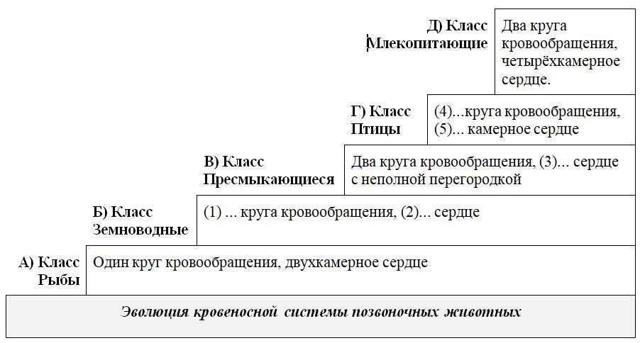1. Заполните схему «Эволюция кровеносной системы позвоночных животных». Напротив класса укажите недостающую информацию (1–5). Ответьте на вопросы.