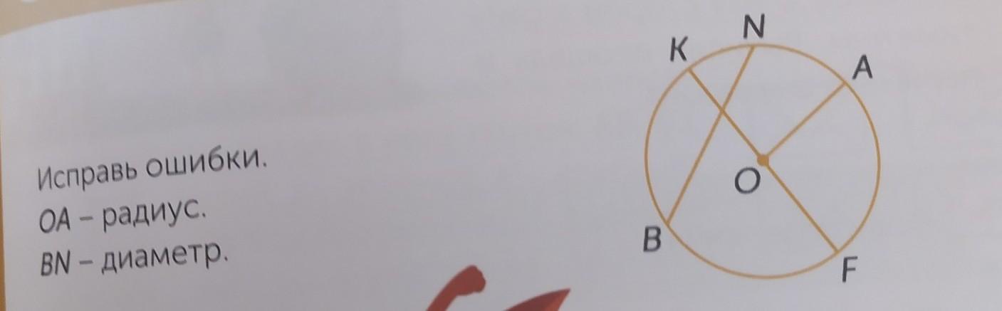 Я могу проверить правильность обозначения радиуса и 5 диаметра. N. K А О Исправь ошибки. ОА - радиус. BN – диаметр. B F