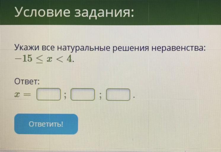 Согласно условию, необходимо указать все натуральные числа. Натуральные числа - это числа 1, 2, 3 и т. д., поэтому числа от -15 до 0 не подходят. Натуральные числа между 0 (потому что нам нужно найти натуральные числа) и 4 - это 1, 2 и 3.