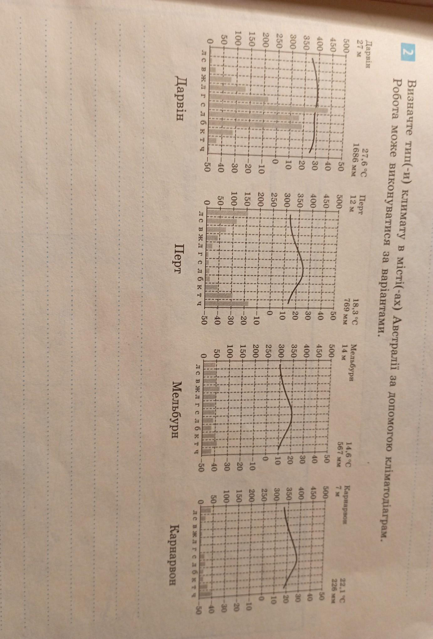 Судячи з даних кліматодіаграм, зокрема показників температури і кількості опадів по місяцях можно визначити типи клімату в запропонованих містах Австралії.