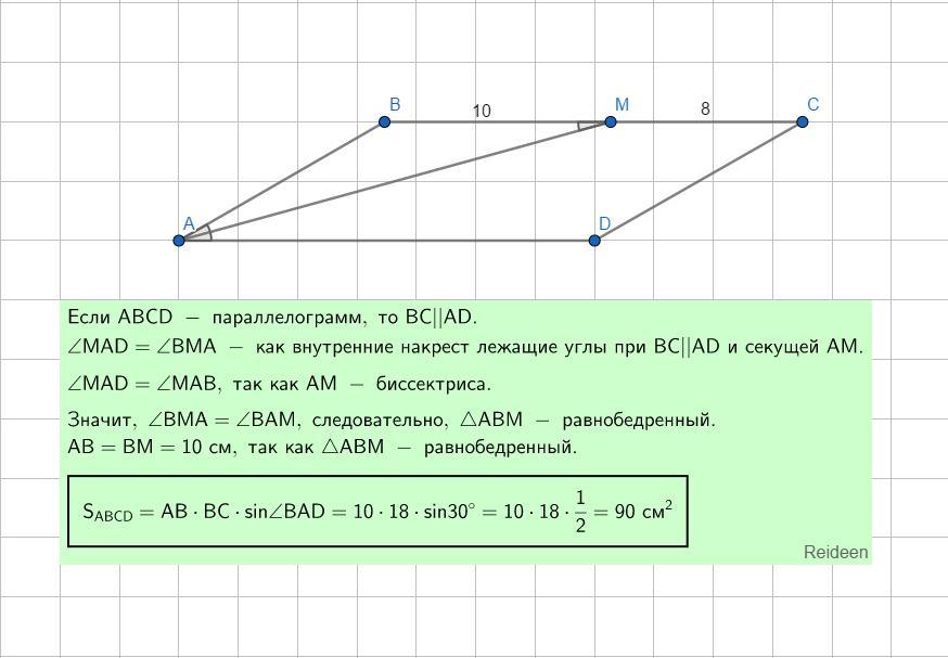 Бісектриса АМ паралелограма ABCD ділить сторону ВС на відрізки ВМ = 10 см, МС= 8 см. Знайдіть площу паралелограма, якщо A=30°. СРОЧНОО!!!! ДАЮ 35 БАЛОВ