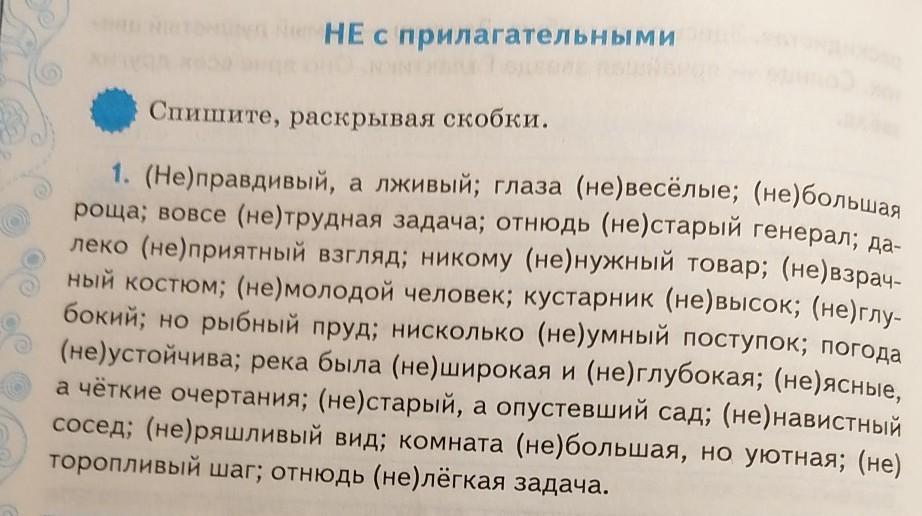 не правдивый, а лживый; глаза невеселые; небольшая роща; вовсе не трудная; отнюдь не старый генерал; далеко не приятный взгляд; никому не нужный товар; невзрачный костюм; немолодой человек; кустарник невысок; неглубокий, но рыбный пруд; нисколько не умный поступок; погода неустойчива; река была неширокая и неглубокая(?); не ясные, а четкие очертания; не старый, а опустевший сад; ненавистный сосед; неряшливый вид; комната небольшая, но уютная; неторопливый шаг; отнюдь не легкая задача