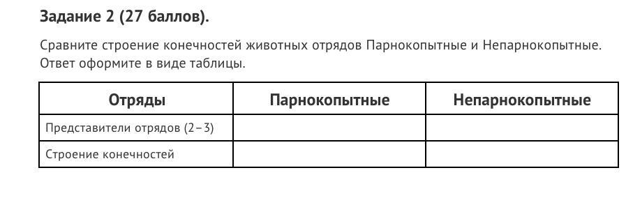 Сравните строение конечностей животных отрядов Парнокопытные и Непарнокопытные. Ответ оформите в виде таблицы.