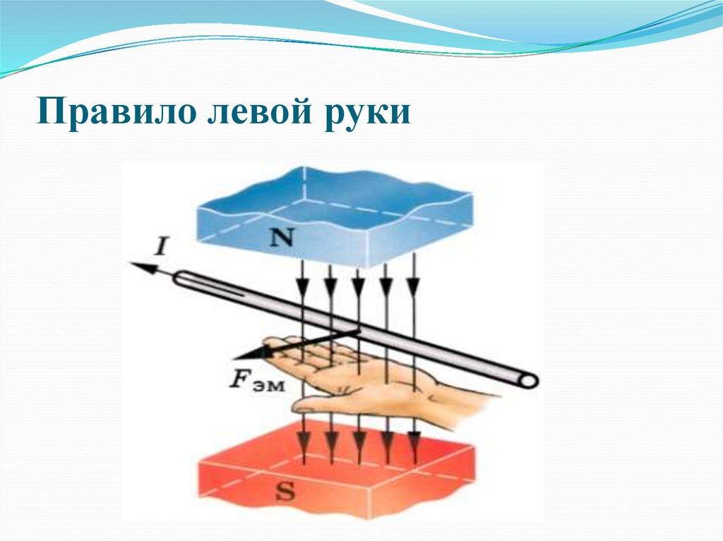 Покрутите левую ладонь. Магнитные линии от N в нее входят. 4 пальца по току. Отогнутый большой показывает направление силы Ампера Fa.