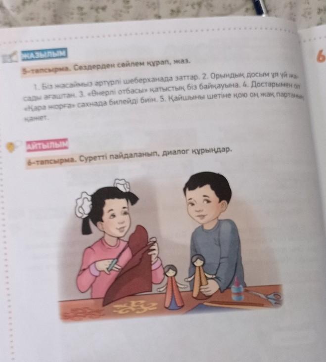 Біз шеберханада әртүрлі заттар жасаймыз.Досым ағаштан орындық үй,ұя жасады.Біз Өнерлі отбасы байқауына қатыстық.Ол достарымен сахнада қара жорға биін биледі.Қайшыны партаның оң жақ шетіне қою қажет.