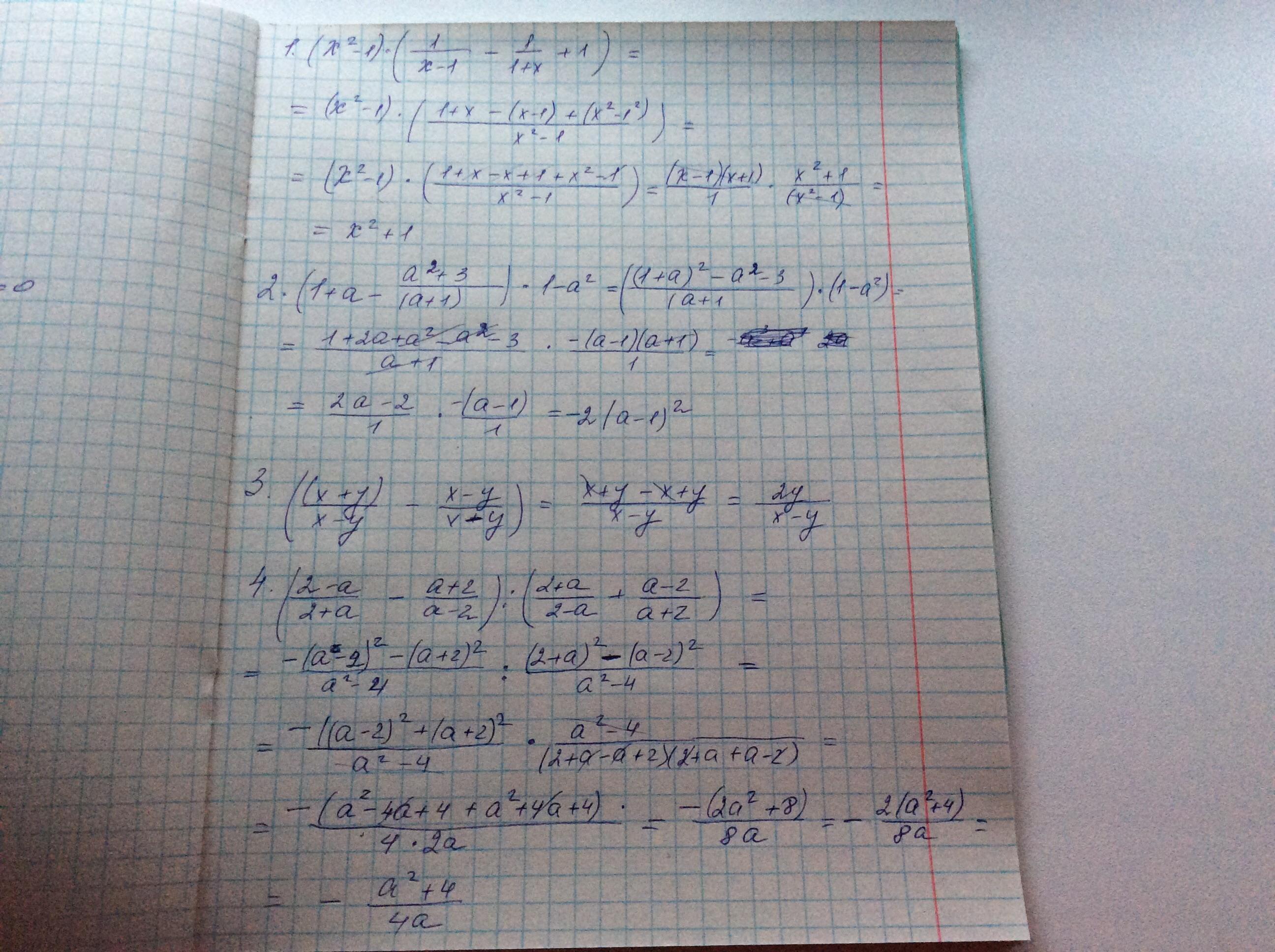 2)[1+a- (a²+3):(a+1)](1-a²) 3)[(x+y):(x-y)-(x-y):(x-y))] 4)[(2-a):(2+a)-(a+2):(a-2)]:[(2+a):(2-a)+(a-2):(a+2)]