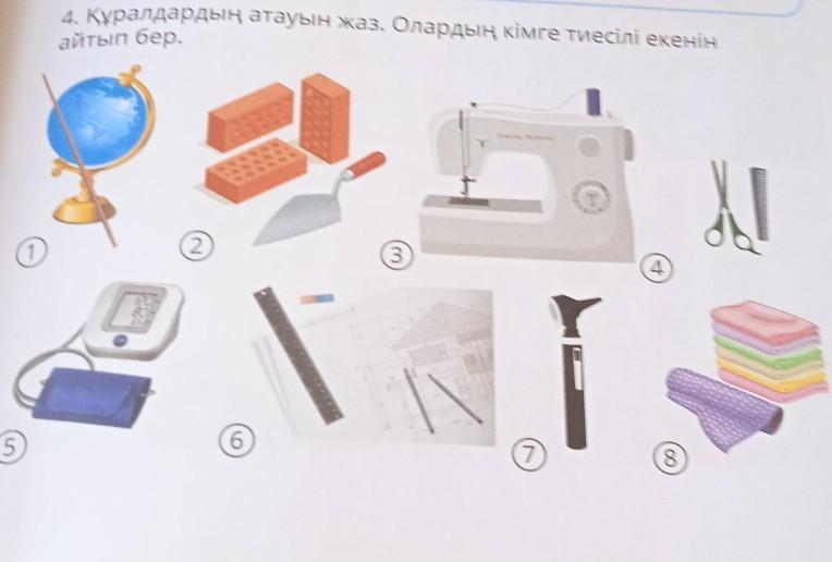 4. Құралдардың атауын жаз. Олардың кімге тиесілі екенін айтып бер. 1 2 3 4 5 6 7 8 6 5 4 ПОМОГИТЕ СРОЧНО ДАМ 30 БАЛЛОВ ВОТ ФОТО