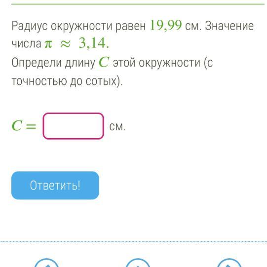 Радиус окружности равен 19,99 см. Значение числа π≈3,14. Определи длину C этой окружности (с точностью до сотых).