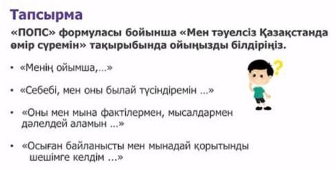 «ПОПС» формуласы бойынша «Мен тәуелсіз Қазақстанда өмір сүремін» тақырыбында ойыңызды білдіріңіз. . «Менің ойымша,...» • «Себебі, мен оны былай түсіндіремін ...» . «Оны мен мына фактілермен, мысалдармен дәлелдей аламын ...» «Осыған байланысты мен мынадай қорытынды шешімге келдім ...»