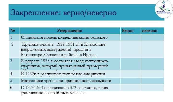 No Утверждения Сталинская модель коллективизации сельского Крупные очаги в 1929-1931 гг. в Казахстане вооруженных выступлений прошли в Батпаккаре Сузакском районе. в Иргизе. В феврале 1935 г. состоялся съезд колхозников 1 2 Верно неверно 3 4 5 6 ударников, который принял новый примерный К 1932г. в республике полностью завершился Мятежники требовали принцип добровольности С 1929-1931гт произошло 372 восстания, в них участвовало около 50 тыс. человек.