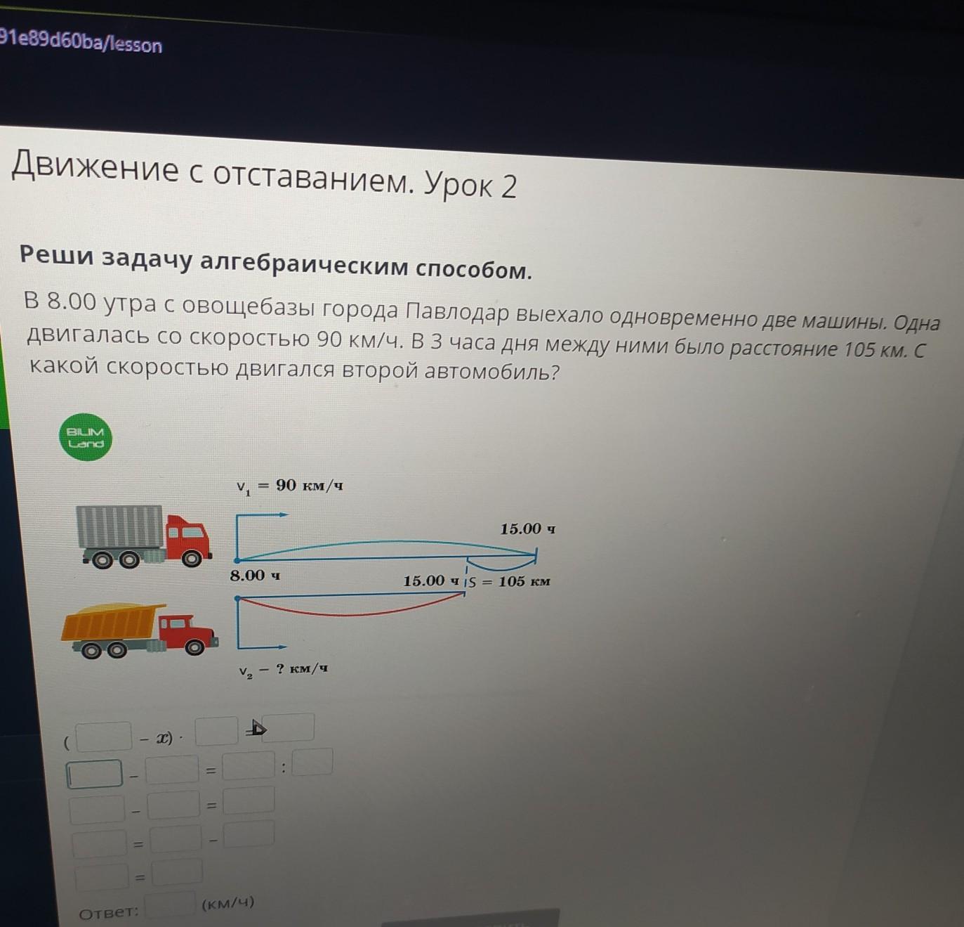 = 90 км/ч 15.00 ч 8.00 4 15.00 ч IS = 105 км v, - ? KM/H = - Е) - - = (км/ч) Ответ: