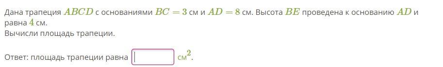 Ответ 55см кв S=(BC+AD)•0,5•BE=(3+8)•0,5•10=55 см кв
