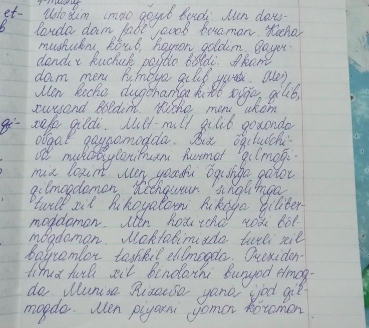 4- mashq. Berilgan qo'shma fe'llarning birinchi qismi qaysi soz turkumi bilan ifodalanganini ayting. Ular ishtirokida 3 ta gap tuzing Imzo qo'ymoq, javob bermoq, hayron qolmoq paydo boʻlmoq, himoya qilmoq, xursand bo'lmoq, xafa qilmoq, milt- milt qilmoq, hurmat qilmoq, qaror qilmoq, hikoya qilmoq. rozi bo'lmoq, tashkil etmoq, bunyod etmoq, ijod qilmoq. yomon koʻrmoq, kasal bo'lmoq