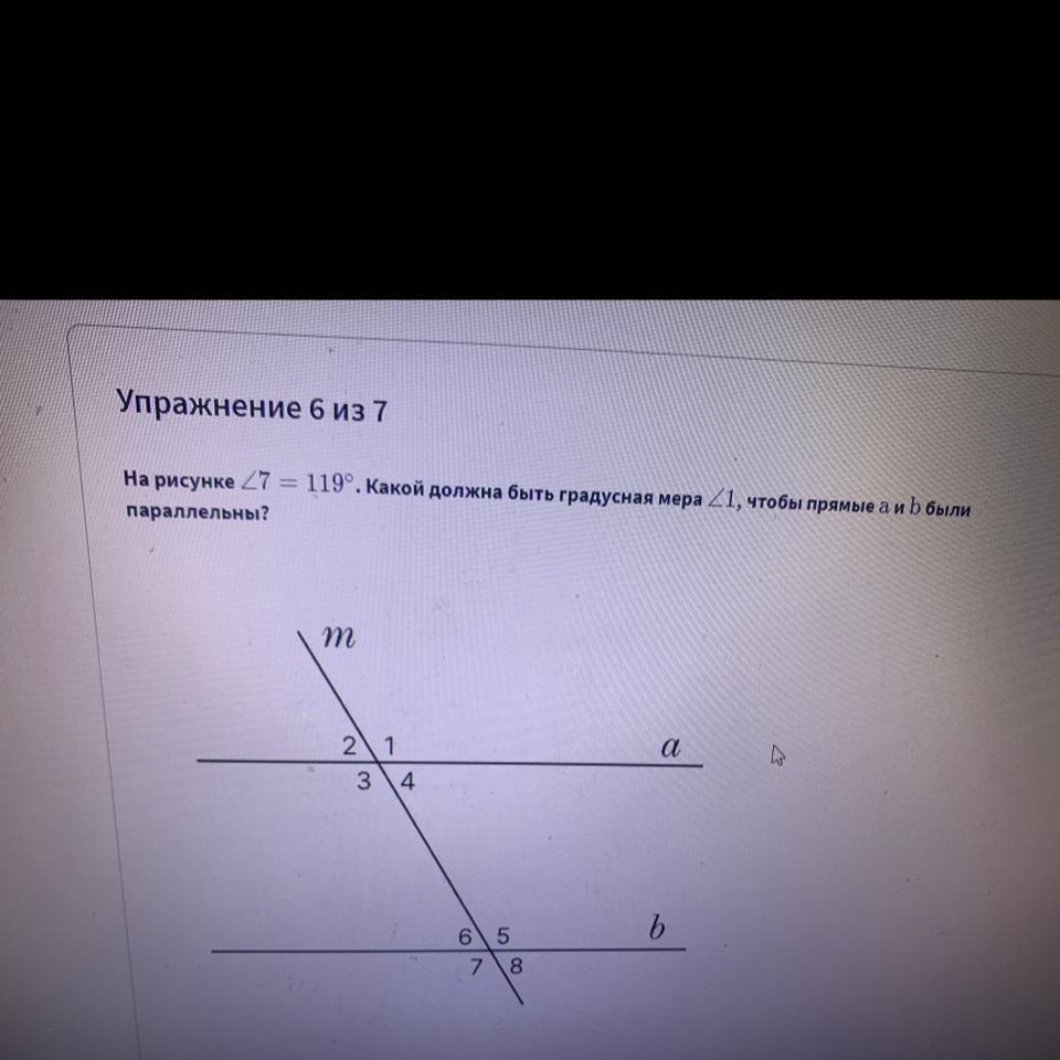 пожалуйста.. помогите!! 40 баллов..!!! на рисунке <7 = 119, какой должна быть градусная меа <1, чтобы прямые а и б. были параллельны ?