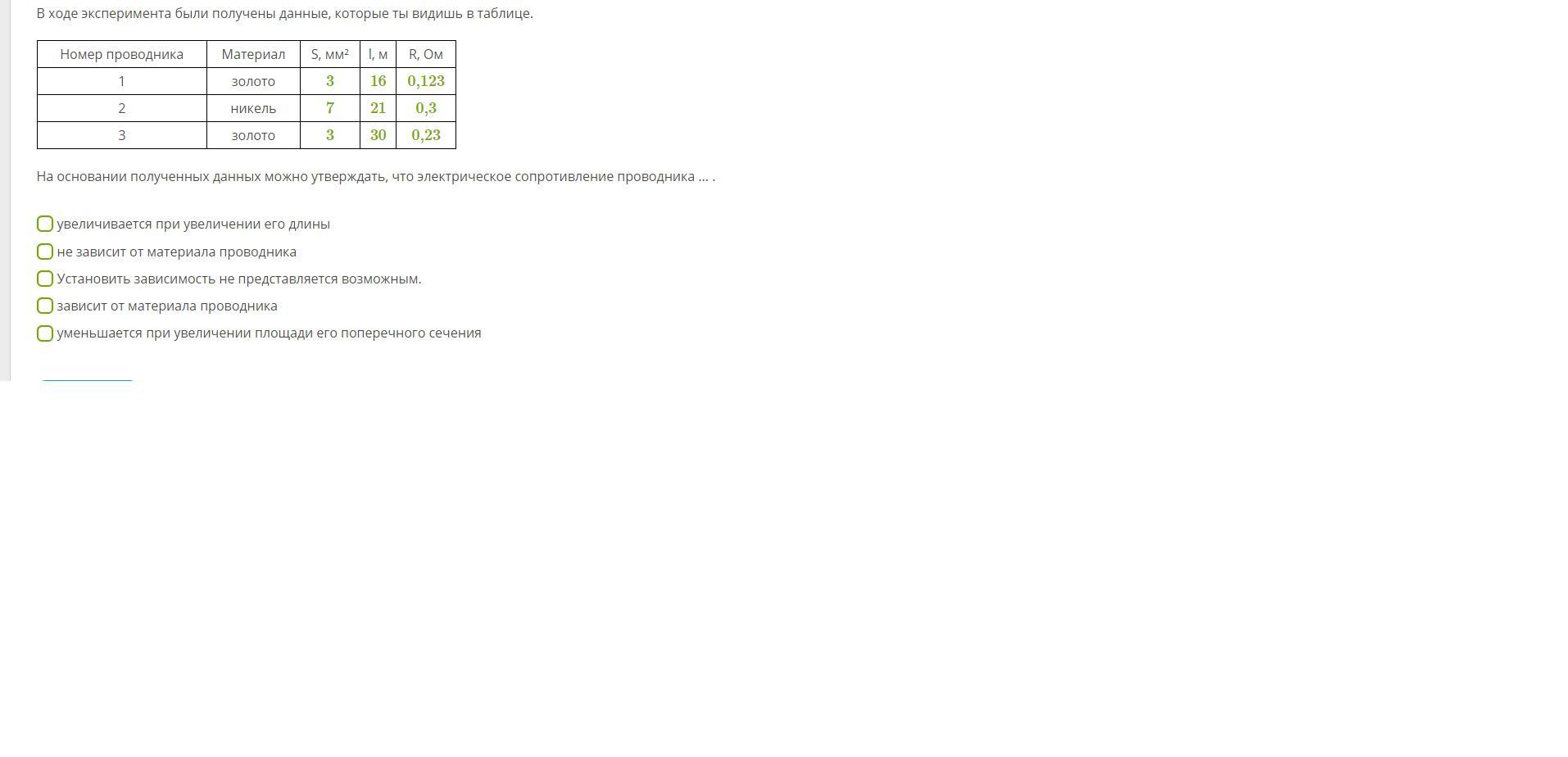 R=p*L/S На основании полученных данных можно утверждать, что электрическое сопротивление проводника зависит от материала проводника (р-удельное электрическое сопротивление ). R-увеличивается при увеличении его длины L. R - уменьшается при увеличении площади его поперечного сечения S.