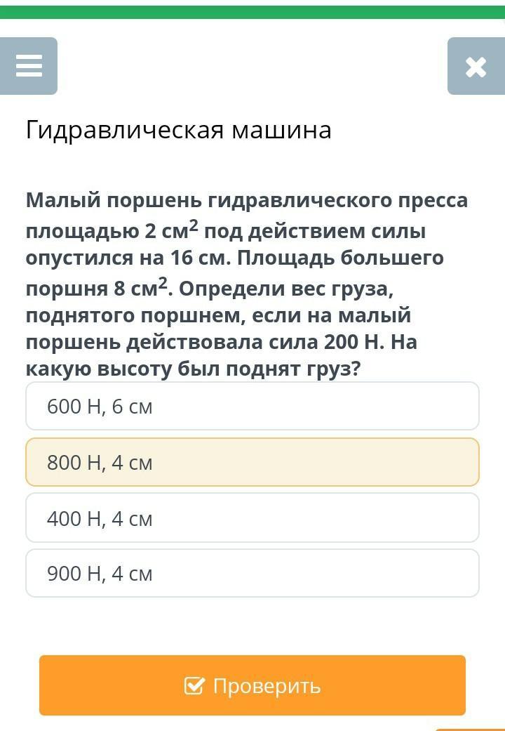 1) F1/F2=S1/S2 =>F2=F1 * S2/S1; F2=200 H * 8cм^2 / 2cm^2 =800H