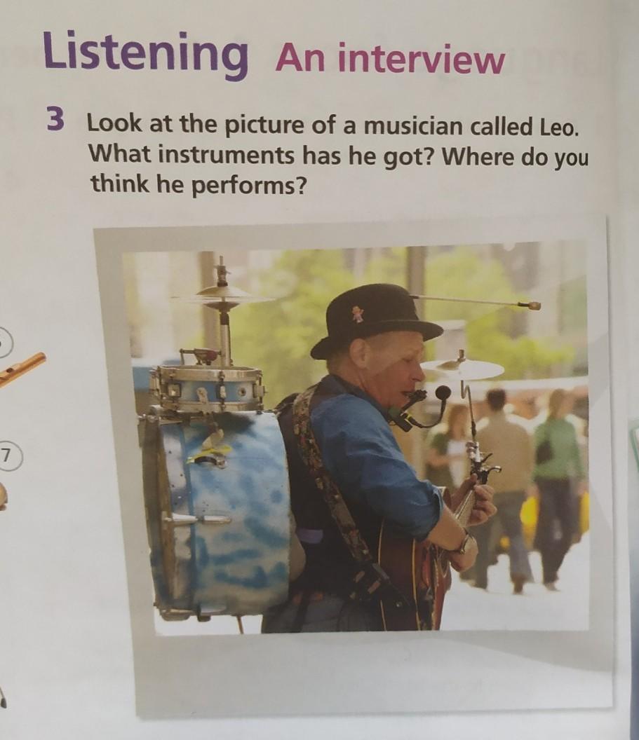 Аудирование Интервью 3 Посмотрите на фотографию музыканта по имени Лео. Какие у него инструменты? Как вы думаете, где он выступает? ты.