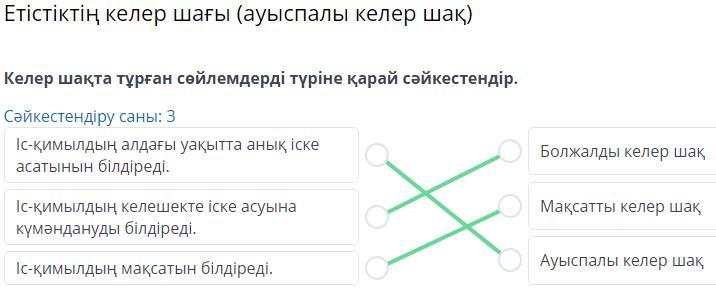 Етістіктің келер шағы (ауыспалы келер шақ) Келер шақта тұрған сөйлемдерді түріне қарай сәйкестендір. Сәйкестендіру саны: 3 Ӏс-қимылдың алдағы уақытта анық іске асатынын білдіреді. Ӏс-қимылдың келешекте іске асуына күмәндануды білдіреді. Ӏс-қимылдың мақсатын білдіреді. Болжалды келер шақ Мақсатты келер шақ Ауыспалы келер шақ Артқа Тексеру