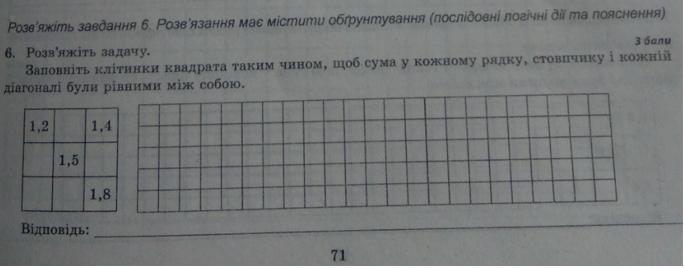 5) найти число в среднем ряду слева: 4,5 - (1,2 + 1,6) = 1,7;