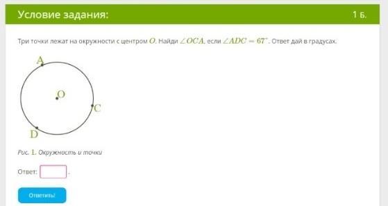 соединим точки так, чтобы получилось два треугольника АДС и АОС. рассмотрим ДАОС. У него АО=СО=радиусу, поэтому <ОАС=<ОСА=67° Сумма углов треугольника составляет 180°, поэтому<АОС=180-67-67=46°