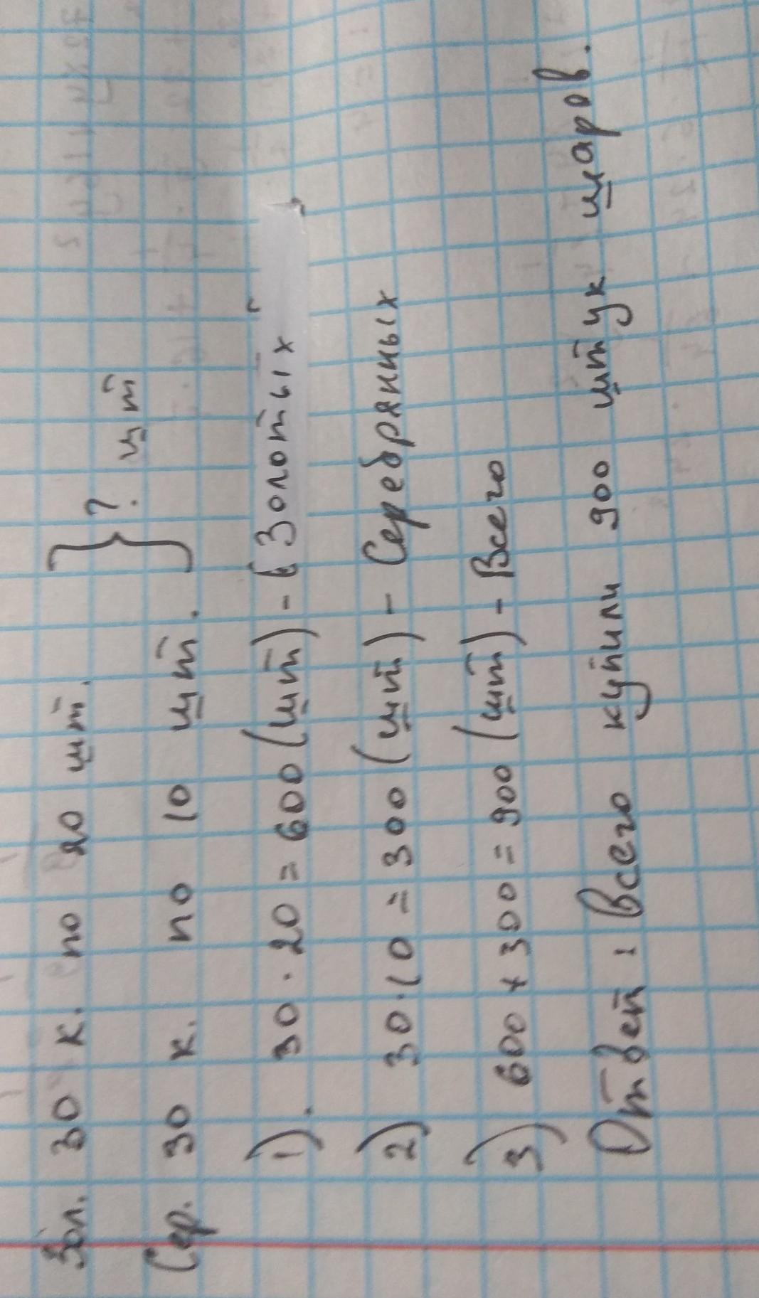 Реши задачу к празднику украшали главную площадь города для этого купили 30 коробок золотых шаров по 20 в каждой и 30 коробок серебряных по 10 штук Сколько всего шаров купили можете ещё сделать запись к задачи