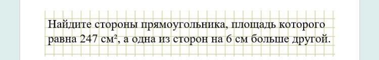 Найдите стороны прямоугольника площадь которого равна 247см^2, а одна из сторон на 6 см больше другой