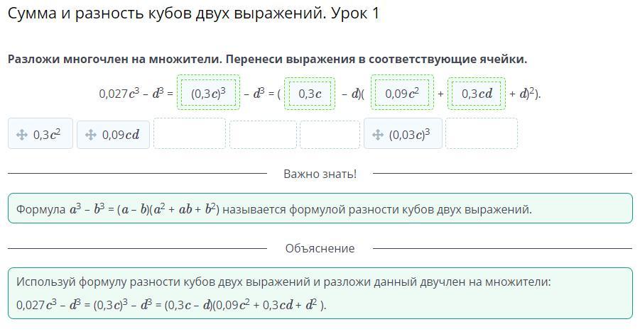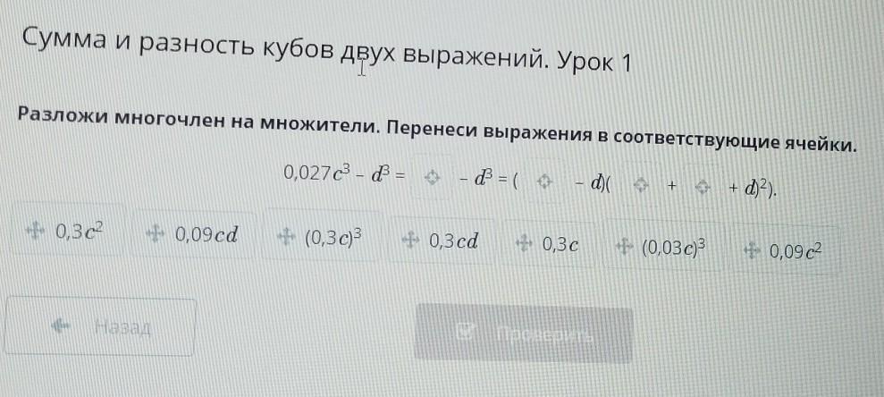 Разложи многочлен на множители. Перенеси выражения в соответствующие ячейки.