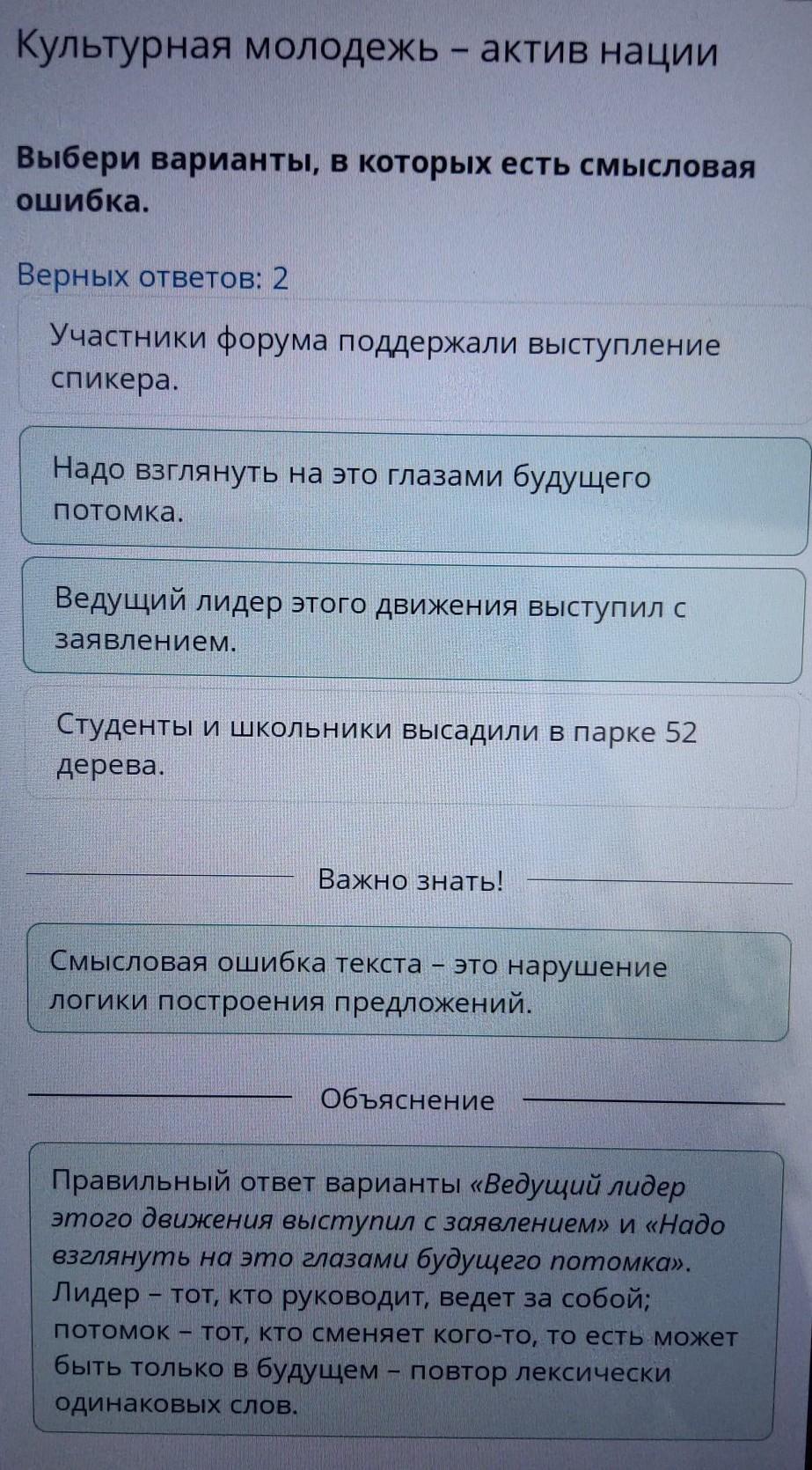 Правельнй ответ варианты "Ведущий лидер этого движения выступил с заявленем" и "Надо взглянуть на это глазами будущего потомка". Лидер - тот, кто руководит, ведёт за собой; потомок - тотя. кто сменяет кого-то, то есть может быть только в будущем - повтор лексически одинаковых слов.