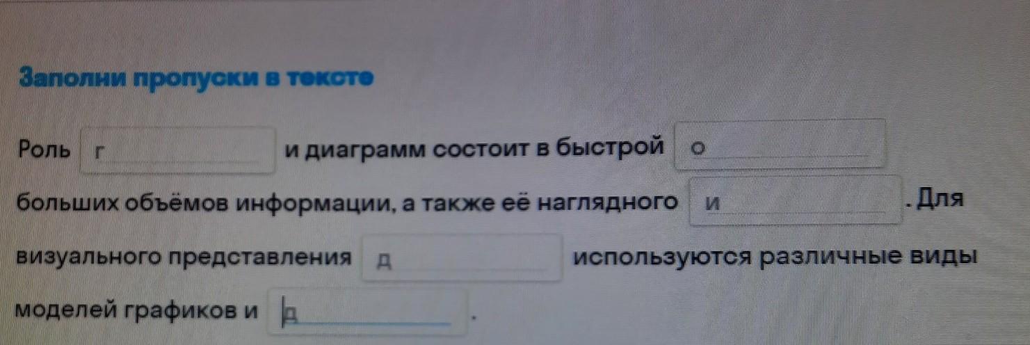 Роль г..... и диаграмм состоит в быстрой о..... больших объемов информации, а также ее наглядного и..... . Для визуального представления д..... используются различные виды моделей графиков и д...... .