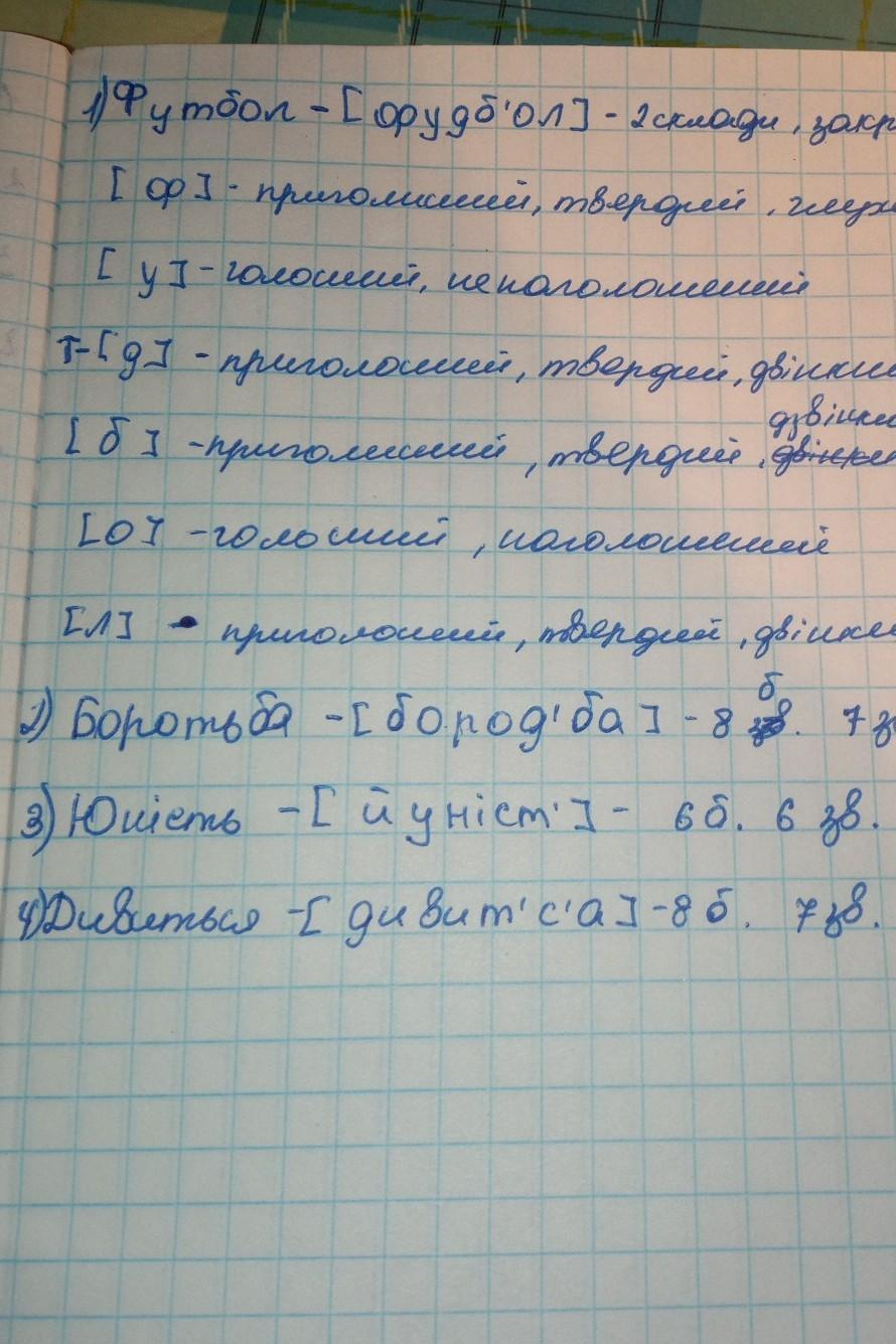 В. Писати, говорити, курити Г. Питати, консервувати, ховати 5. Чергування голосних відбувається в усіх прикладах, окрім А.ш…сть- ш…сти Б.сх…ди- сх…дці В.джм..ль-джм..ля Г.ст..лець- ст…льці 6.звук [т] є у всіх словах рядка А.брати, тінь, тиснути Б.боротьба, діло, торба В.торт, тужити, брати Г.затримати, бігти, біжіть 7.запишіть фонетично: Дивиться, футбол, боротьба, юність 8.доберіть до поданих слів форму або спільнокореневе слово, щоб відбувалося чергуванння голосних: Школа, село, грім,двір 9.доберіть до поданих слів форму або спільнокореневе слово, щоб відбувалося чергування приголосних : Летіти, муха,аптека , порізати 10. утворіть від поданих іменників прикметники та , додавши іменник, утворені словосполучення запишіть: Користь, область, контраст, освіта