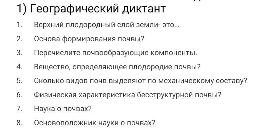 1) Географический диктант 1. Верхний плодородный слой земли- это… 2. Основа формирования почвы? 3. Перечислите почвообразующие компоненты. 4. Вещество, определяющее плодородие почвы? 5. Сколько видов почв выделяют по механическому составу? 6. Физическая характеристика бесструктурной почвы? 7. Наука о почвах? 8. Основоположник науки о почвах?