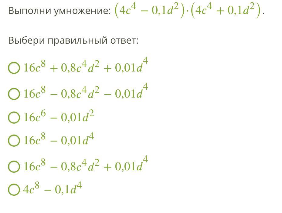 (4c^4-0,1d^2)×(4c^4+0,1d^2) = 16c^8 + 0,8c^4d^2 - 0,8c^4d^2 - 0,01d^4 = 16c^8 - 0,01d^4. Ответ: 16c^8 - 0,01d^4 --- Объяснение: +0,8c^4d^2 и -0,8c^4d^2 мы вычеркнули, так как они противоположные. ^ это степень.