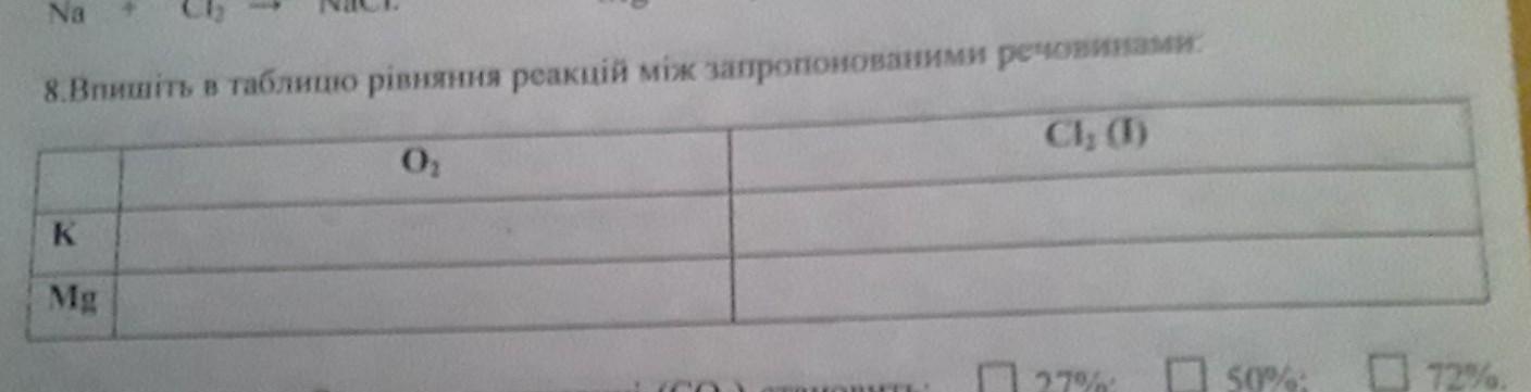 поможіть будьласка очень срочно нужна помощ. випишіть в таблицю рівняння реакції між