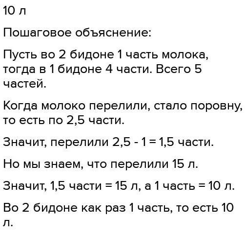 В бидоне в 4 раза больше молока,чем во втором.Если из первого бидона перелить 15 л молока во второй бидон, то молока в первом бидонах станет поравну. Сколько молока в каждом бидоне