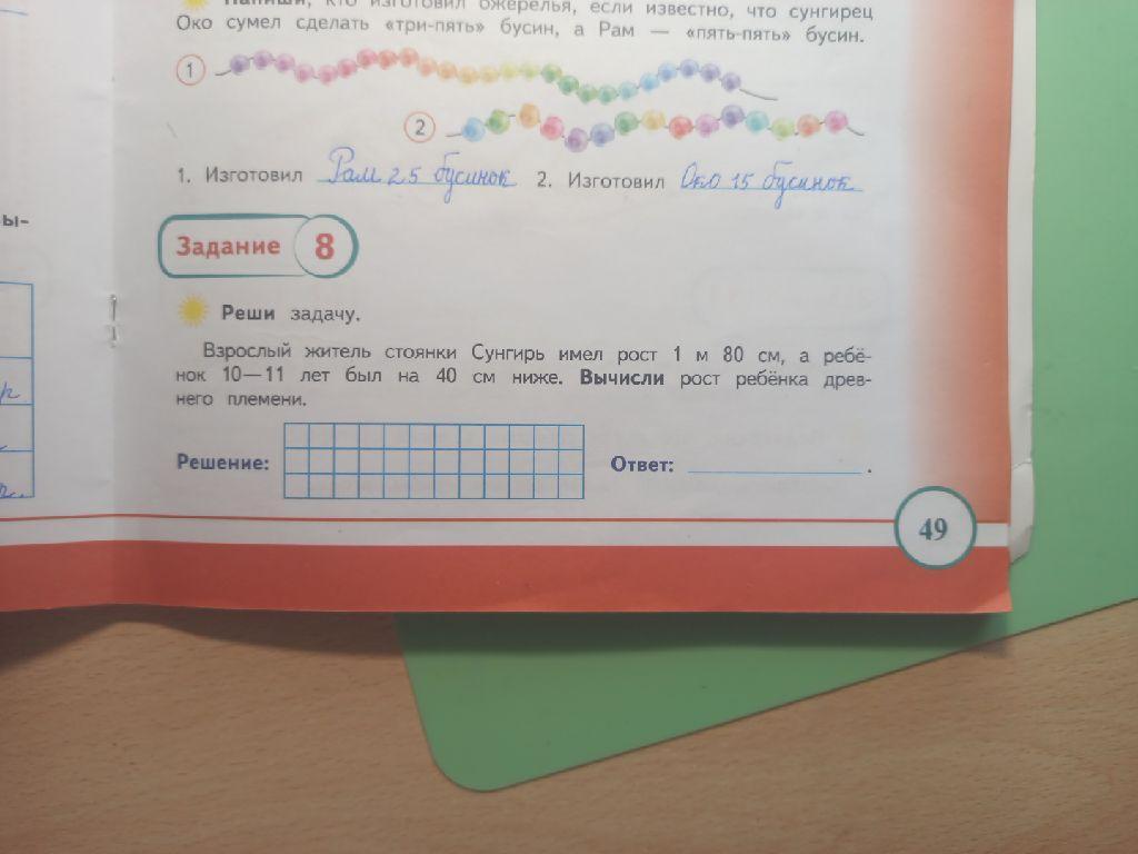 Взрослый житель стоянки Сунгирь имел рост 180см. А ребёнок НА 40 см. ниже, значит: 180-40=140см.
