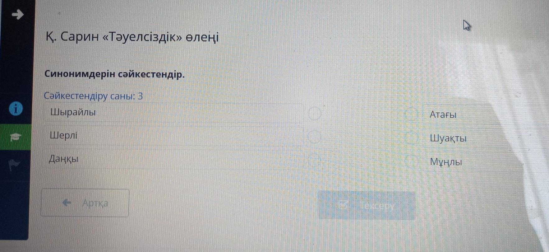 Қ. Сарин «Тәуелсіздік» өлеңі Синонимдерін сәйкестендір. Сәйкестендіру саны: 3 Шырайлы Атағы Шерлі Шуақты Даңқы. Мұңлы нен Артқа В Тексеру ПОЖАЛУЙСТА ПОМОГИТЕ 5 МИНУТ ДАЮ 50 БАЛЛОВ