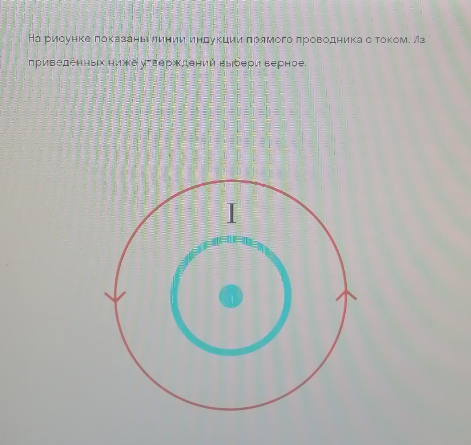 На рисунке показаны линии индукции прямого проводника с током. Из приведенных ниже утверждений выбери верное: