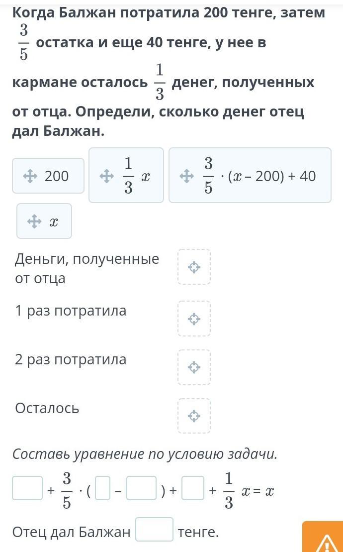 СРОЧНО, ДАМ 75 БАЛЛОВ. Решение текстовых задач с помощью уравнений. Урок 5 Когда Балжан потратила 200 тенге, затем остатка и еще 40 тенге, у нее в кармане осталось денег, полученных от отца. Определи, сколько денег отец дал Балжан. Деньги, полученные от отца 1 раз потратила 2 раз потратила Осталось Составь уравнение по условию задачи. + ∙ ( – ) + + x = x Отец дал Балжан тенге.
