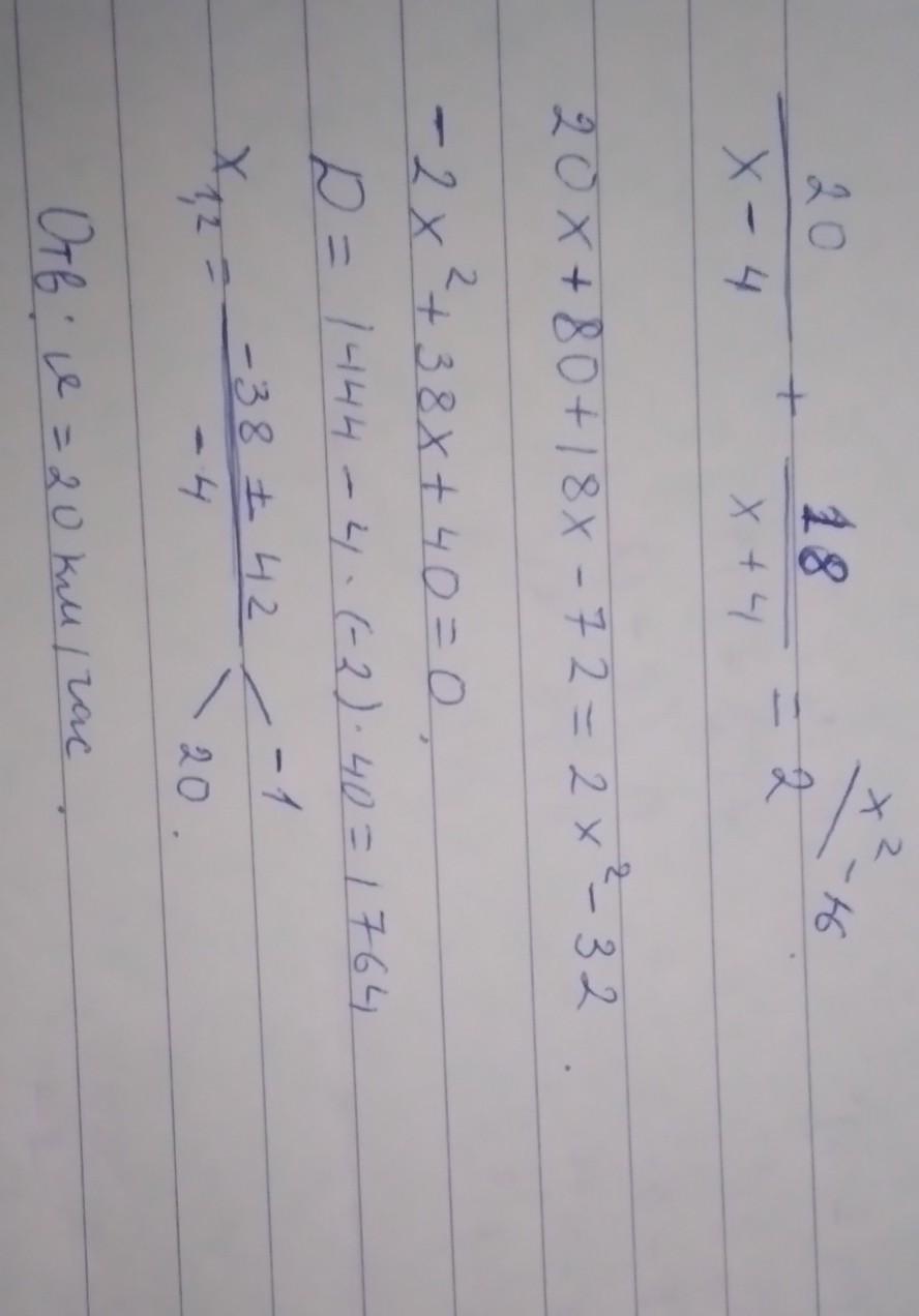 Моторная лодка прошла 20 км против течения реки и 18 км по течению, затратив на весь путь 2 ч. Найдите скорость лодки в стоячей воде, если скорость течения реки равна 4 км/ч.