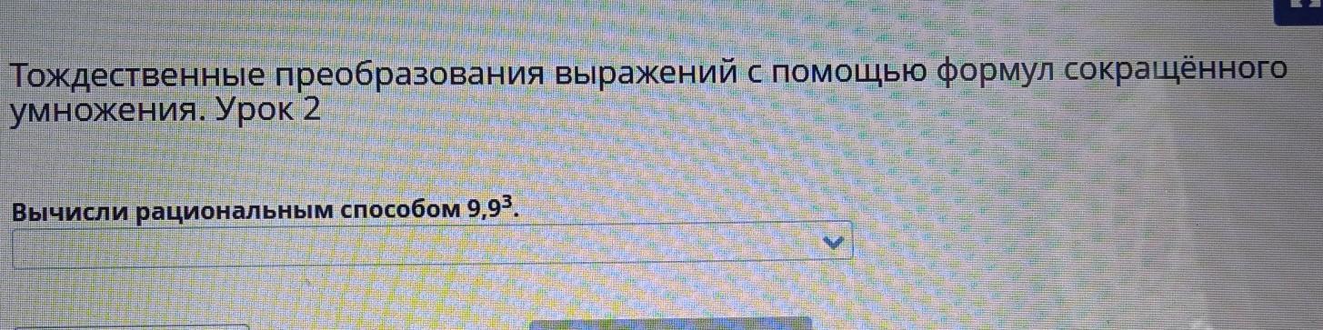 Тождественные преобразования выражений с помощью формул сокращённого умножения. Урок 2 Вычисли рациональным способом 9,9^3.
