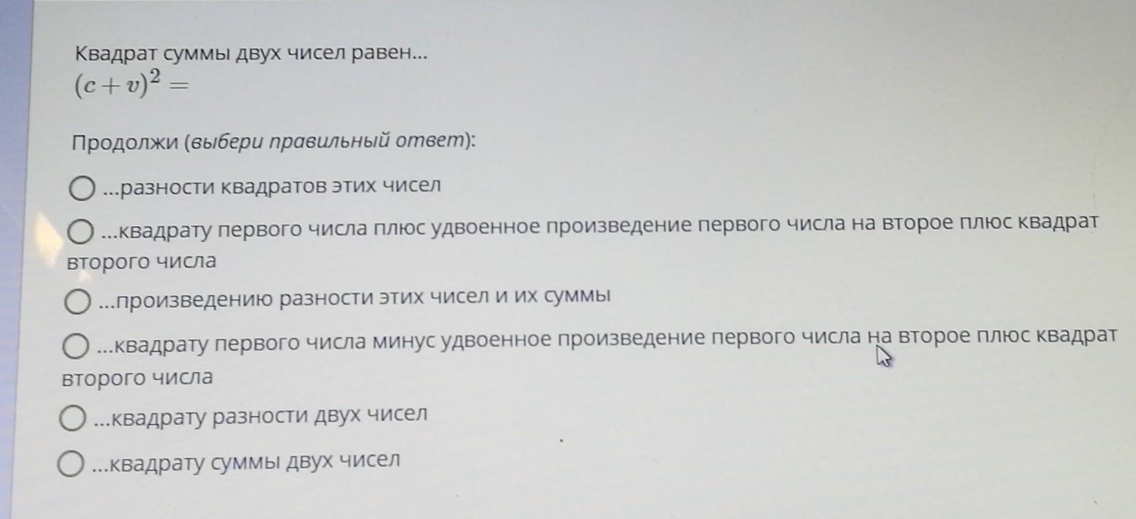 квадрат первого числа плюс удвоенное произведение первого числа на второе плюс квадрат второго числа
