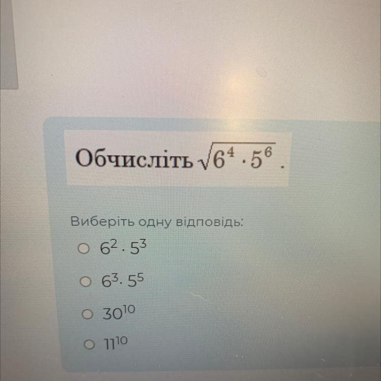 sqrt ( 6^4 × 5^6 ) = sqrt ( 6^(2×2) × 5^(3×2) ) = 6^2 × 5^3