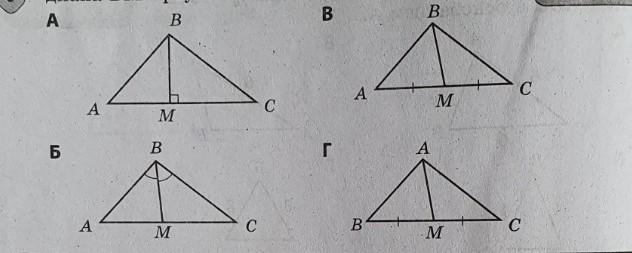 укажите рисунок на котором изображена медиана BM , треугольника ABC помогите пж