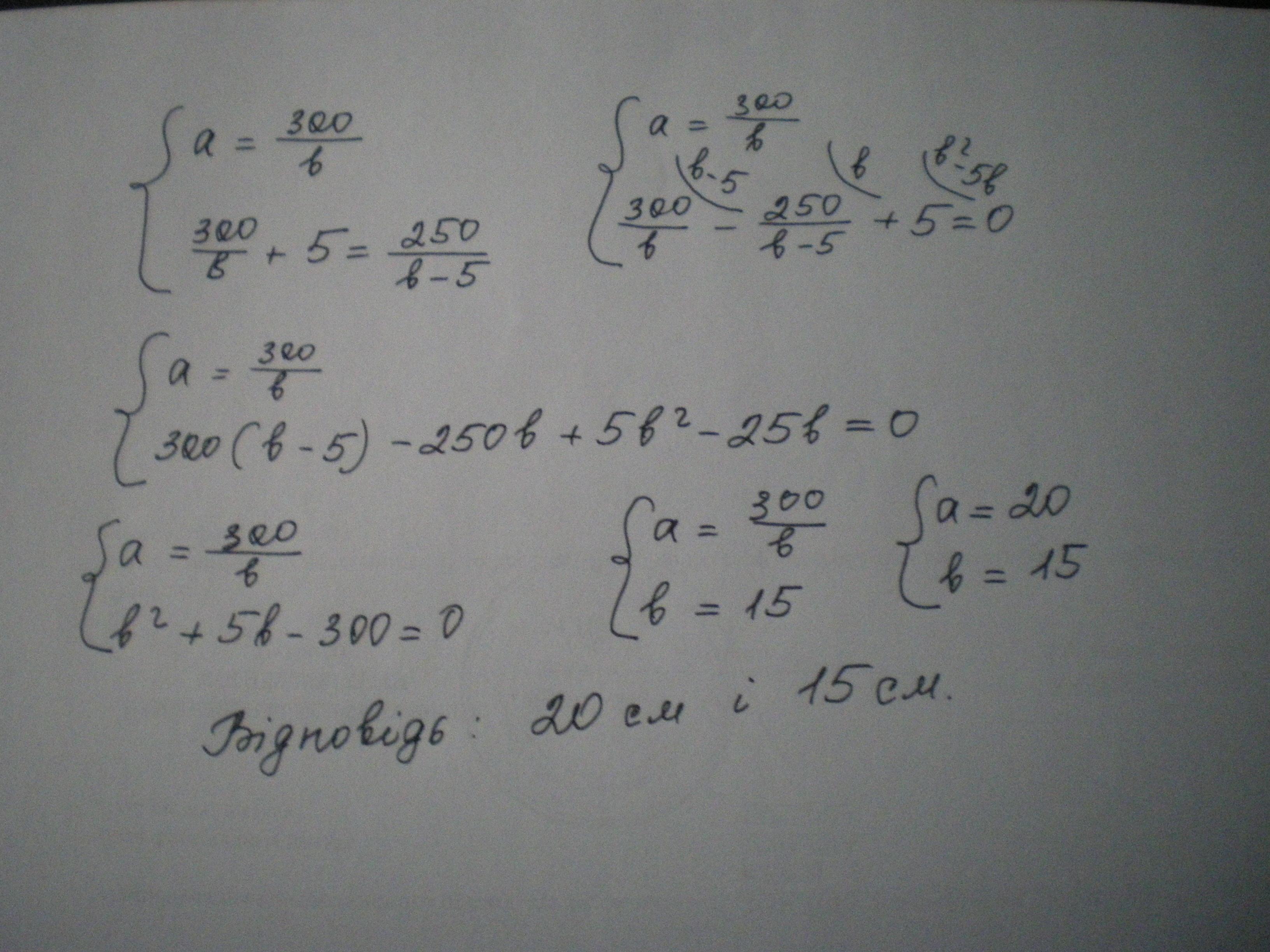 Ответ: Нехай довжина а, а ширина в. Маємо систему рівнянь:а*в=300(а+5)*(в-5)=250