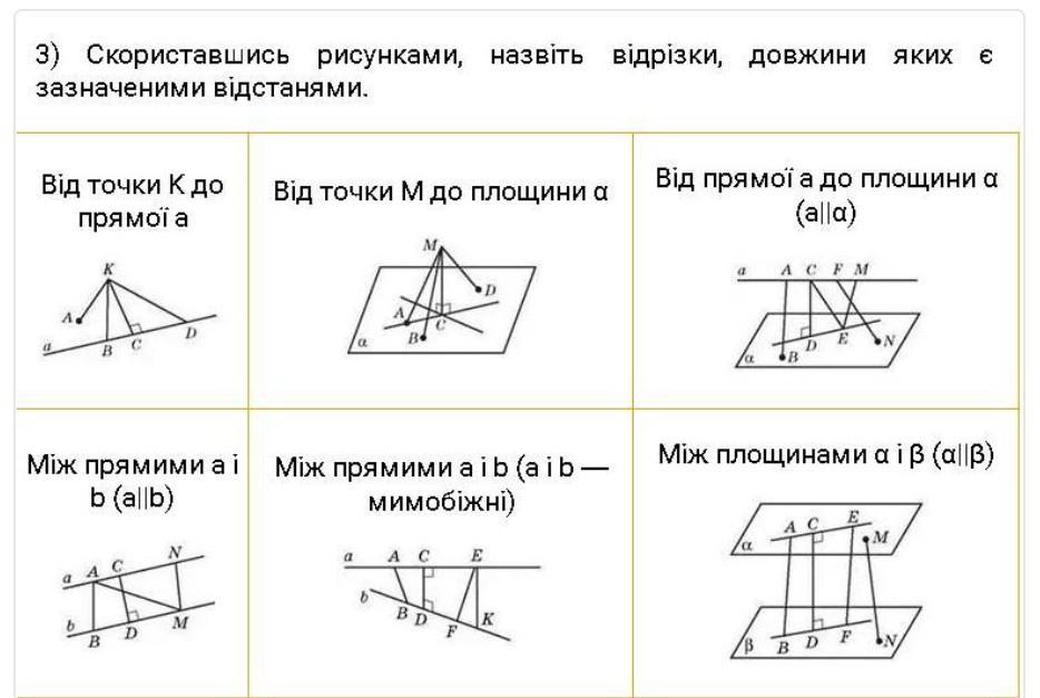 Скориставшись рисунками, назвіть відрізки, довжини яких є зазначеними відстанями. Від точки К до прямої а 2) Від точки M до площини а 3 Від прямої а до площини а (alla) K Ас FM Ad D a В N B В Між площинами aiB (а][B) -1) Між прямими aiЬ (а||b) 5 Між прямими аib (a iЬ — мимобіжні) Ас Е. M а А СЕ А с а т Вр к b F В E B.