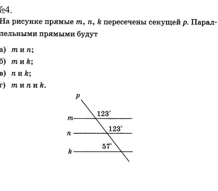 - Смежный угол углу, который расположен на прямой k, равен 123°, т.к. 180-57=123°→По 2 признаку параллельности прямых k || n→m || n || k.